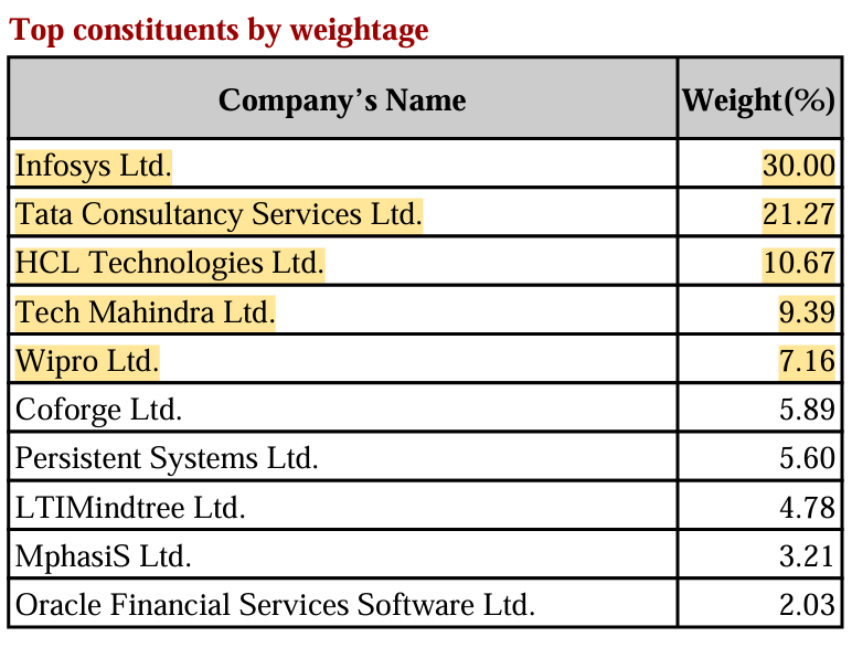 IT stocks are core components of both the Nifty IT Index (Infosys, TCS, HCL, Wipro, Tech Mahindra together comprise over 75% weight within the sector index) and the broader benchmark indices