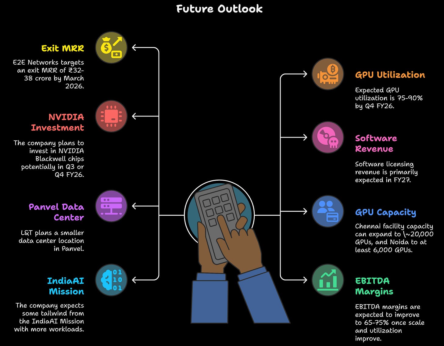L&T stake: ₹1,079 Cr infusion; L&T is using E2E for digital transformation workloads. E2E is partnering with L&T on digital transformation initiatives by providing AI-optimized GPU infrastructure and high-performance computing. Management is focused on leveraging synergies and expanding business within the L&T ecosystem.