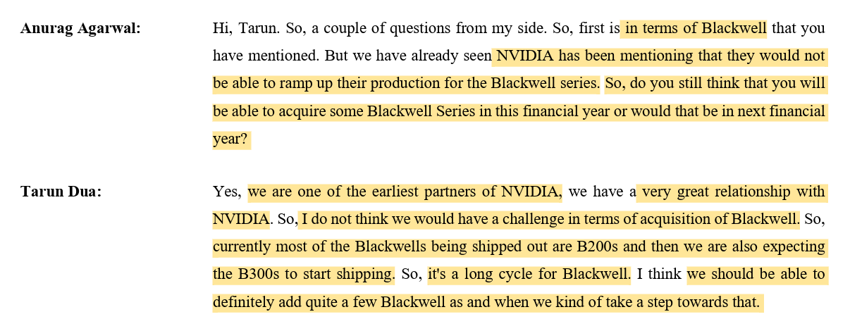 NVIDIA Supply Risk: “We’re their earliest partners, Blackwell won’t be an issue.” Management looks highly confident about securing cutting-edge NVIDIA technology due to a strong partnership, and strategic/flexible about exploring other vendors based on market demand.