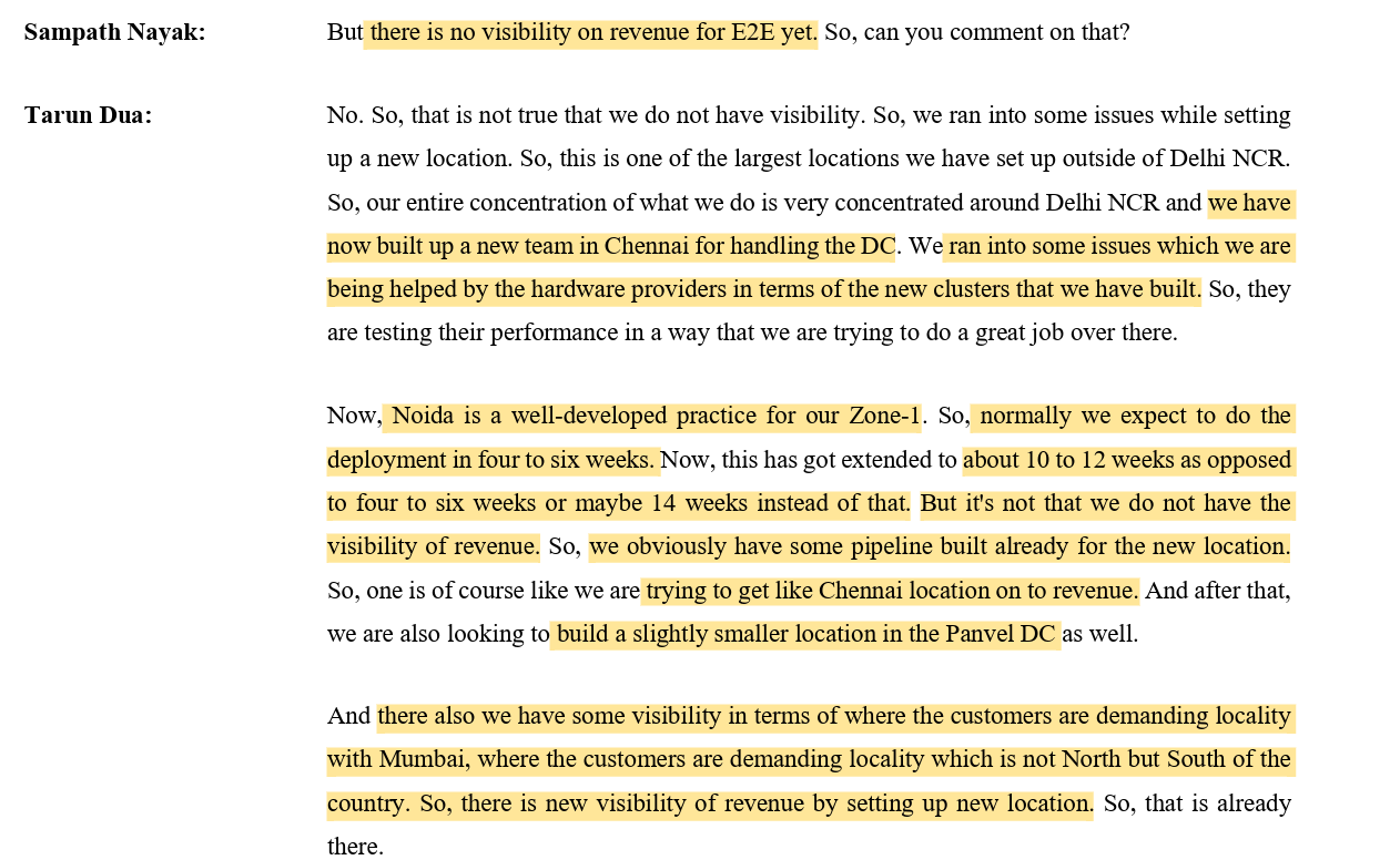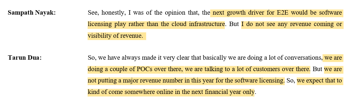 Management looked to me Defensive yet confident about future revenue from L&T, they were transparent about operational delays, and prudent/realistic about E2E's specific role within the larger L&T ecosystem. Delays are technical, not demand-side.