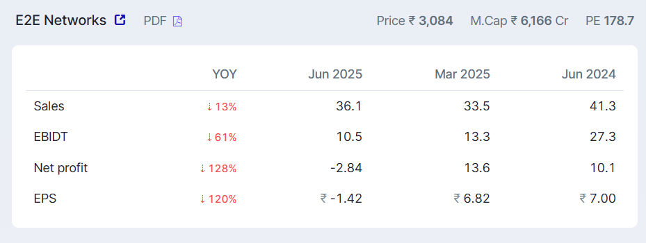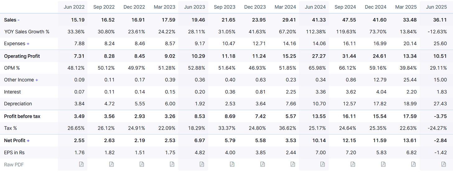 EBITDA: ₹10.51 Cr (-61.5% YoY); margins shrunk from 65.98% → 29.11%.