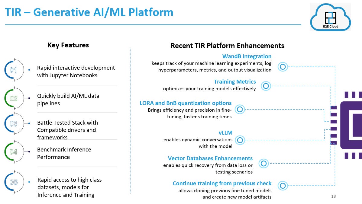 Launched in 2023, TIR is E2E’s flagship AI/ML development environment. Think of it as the “toolkit” for GenAI builders.