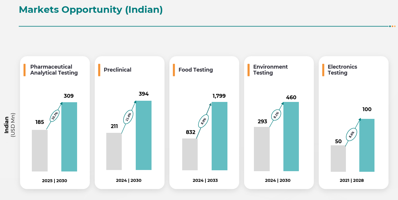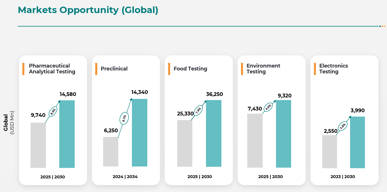Short term (FY26): Stable growth, driven by pharma testing, strong clinical trial demand, new electronics labs, and international clients (75% of CR revenues).