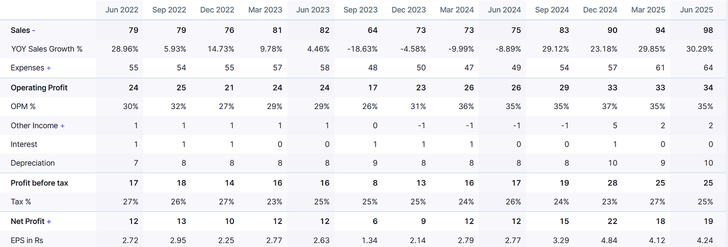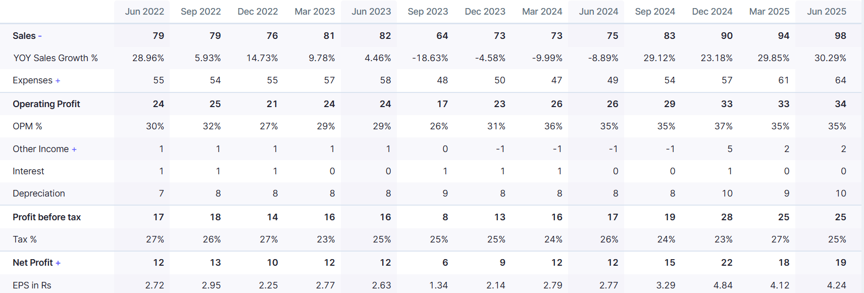 Revenue: ₹98 Cr, (up 30.3% YoY & 3.30% QoQ)