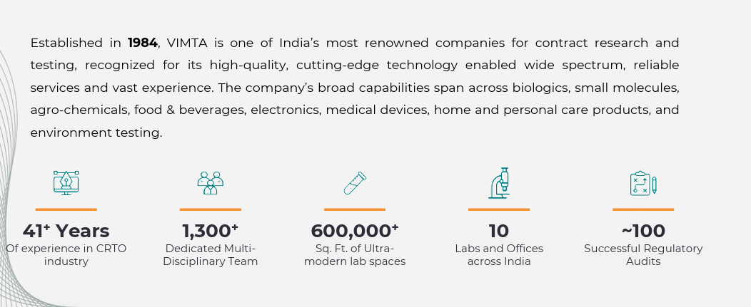 Vimta Labs, headquartered in Hyderabad’s Genome Valley, is a Contract Research Organisation and Testing, Inspection, and Certification Organisation (CRO + TIC).